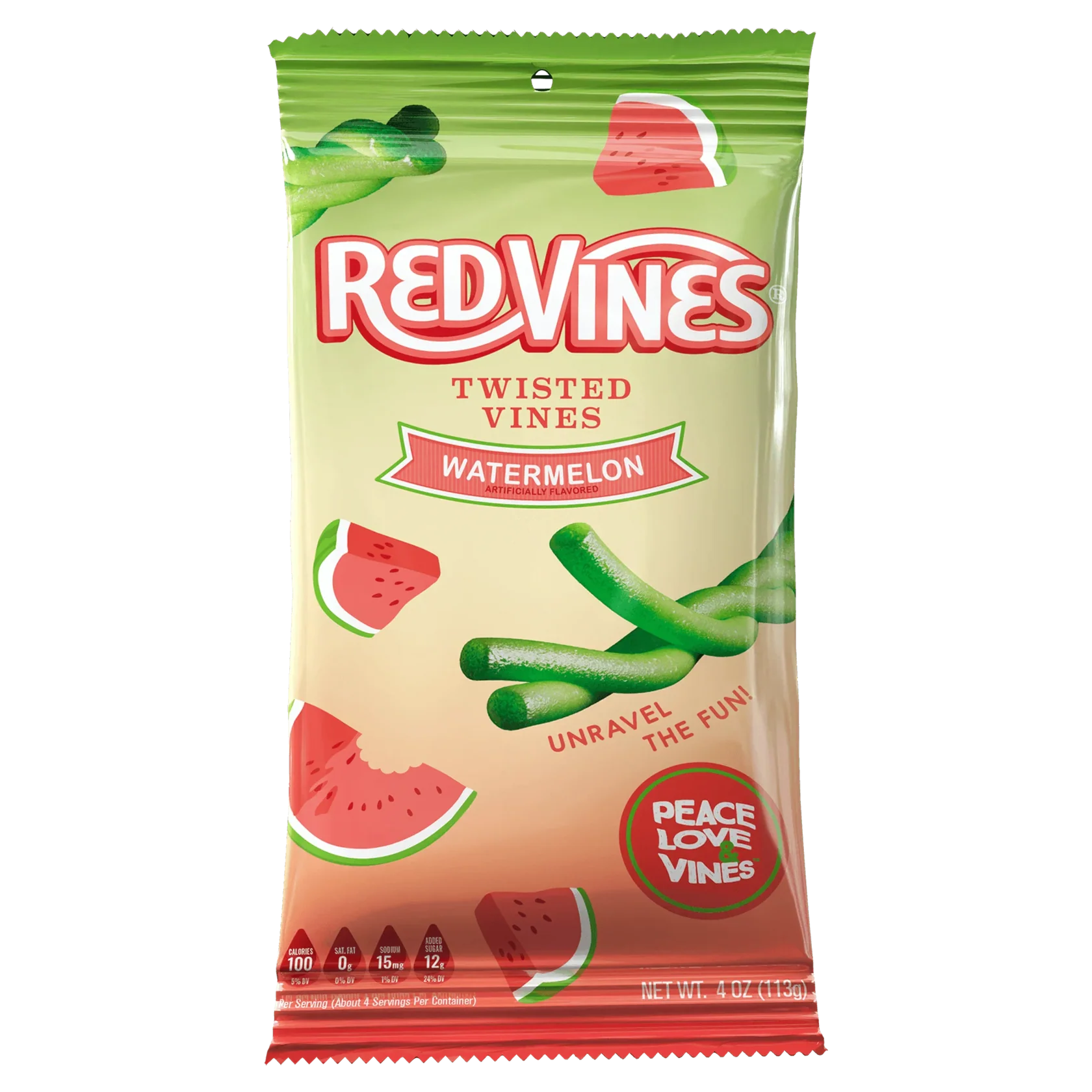 ntroducing Red Vines Watermelon Twisted Vines – a fresh, peelable licorice twist on a West Coast classic! We’ve taken the iconic Red Vines you’ve loved for decades and given them a playful upgrade: three juicy watermelon-flavored strands raveled together for endless peel and play fun. Snack, share, or unravel your way to sweet satisfaction! Plus, the perfectly sized 4oz bag slips into your purse, backpack, or even your car’s cup holder—because good vibes (and great candy) should always be within reach.